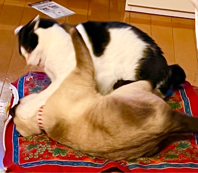 セニョリータとマダム 夜中の座布団抗争 2022年11月15日 00:45 夜中に~座布団で寝ていたモナのところに来たマダム。フレンドリーに舐め舐めし始めて~まあ(*^-^*)仲良しでいいわね~~とほのぼの見ていたがマダム:頭押さえつけ ガブ!!セニョリータ:何するのよ!ババア!!マダム:誰がババアよ!小娘!ふんぎゃぎゃぎゃぎゃ~~~!!!あぎゃぎゃぎゃぎゃぎゃ~~~!!!ふー、ふー、う~~~う~~~はっ!!!マダム:アタクシ達、喧嘩等していなくてよ おほほほほほセニョリータ:あたち達、仲良くしてるよ、ママ。 そして、この座布団はアタチのよ!と、人間が見ていると気づくと同時に体裁作る猫達なのであった・笑最近よく仲良くこういう猫プロレスしています・笑 「マダム・ボヌール」カテゴリの最新記事 タグ :#マダム・ボヌール#保護猫#白黒猫#はち割れ猫#猫プロレス#猫あるある#セニョリータ・モナ#シャムネコ#サル猫#あほ猫 < 前の記事次の記事 > コメント コメントフォーム 名前 コメント 記事の評価 リセット リセット 顔 星 情報を記憶 コメントを投稿する