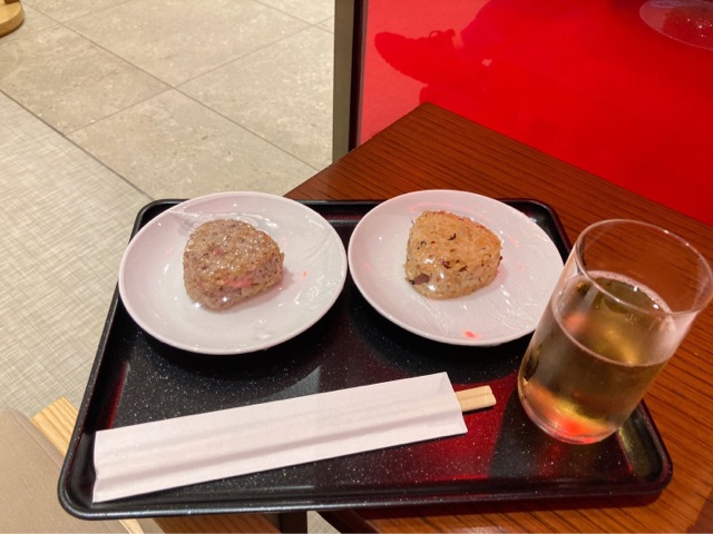 沖縄のおこわご飯のおにぎりとさんぴん茶。